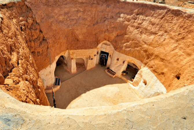 Locuinta traditionala in stil troglodit din Matmata este principala sa atractie. Pentru a scapa de caldura extrema a platoului arid al zonei, localnicii au sapat adanc in pamant, sapand o groapa circulara mare sub suprafata, care avea sa actioneze ca o curte, apoi s-au ingropat in peretii gropii pentru a scobi camerele din pestera pentru spatiile lor de locuit. .