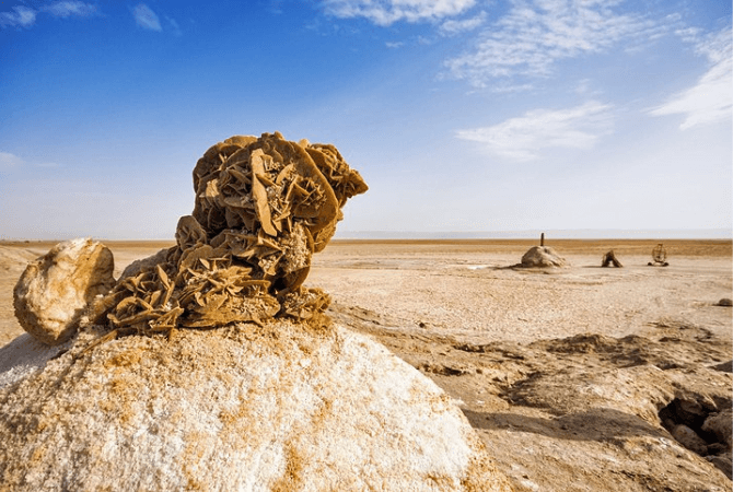 Vara, imprejurimile peisajului lunar din Chott el Djerid sunt o panorama de carti de povesti adusa la viata, plina de miraje sclipitoare la orizont si piese de puzzle din pamant orbitor de alb, crapat sub picioare.