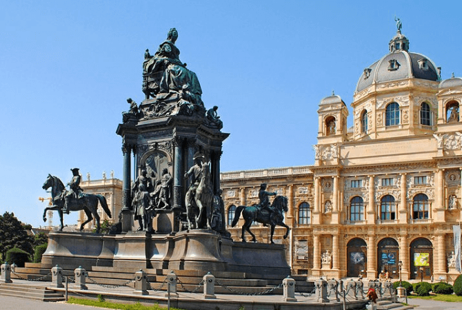 Muzeul are vedere la Maria-Theresien-Platz, al carui punct focal este maretul monument al imparatesei Maria Tereza. Statuia a fost comandata de Franz Joseph I si a fost dezvelita in 1887. Acest monument masiv o infatiseaza pe imparateasa pe tronul ei in timp ce era inconjurata de personaje importante ale vremii ei, inclusiv un numar de generali calare. Reliefurile inalte infatiseaza figuri illustre din domeniile politicii; economie; si arte, inclusiv Haydn, Gluck si Mozart.